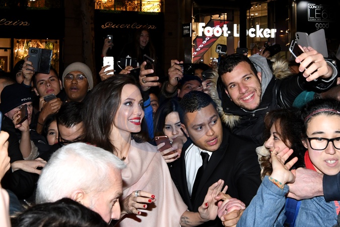 Angelina Jolie w tlumie fanow przed Domem Mody Guerlain