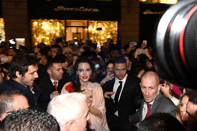 Angelina Jolie w tlumie fanow przed Domem Mody Guerlain