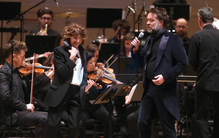 Jane Birkin w garniturze i trampkach na scenie