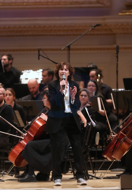 Jane Birkin w garniturze i trampkach na scenie