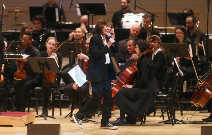 Jane Birkin w garniturze i trampkach na scenie