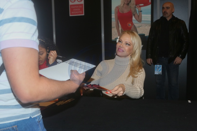 Pamela Anderson z kwiatem we wlosach podczas 25. edycji Paris Manga & Sci-Fi Fair