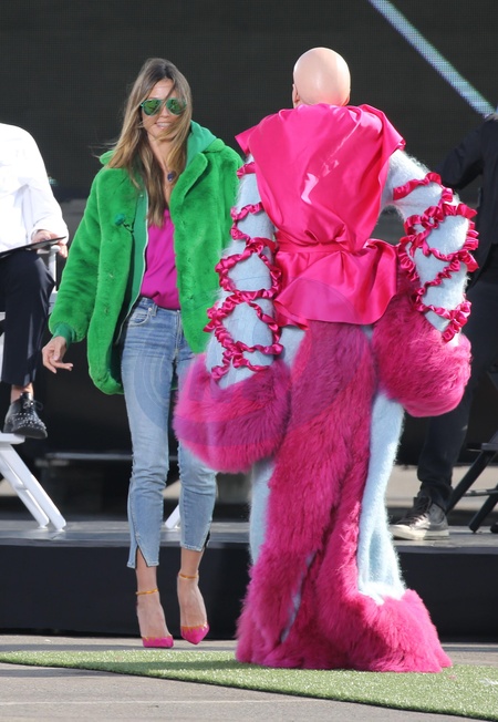 Heidi Klum w zielonym futerku na planie Next Top Model
