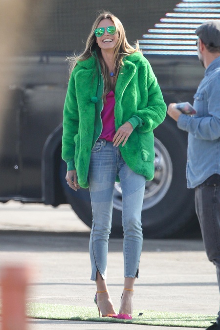 Heidi Klum w zielonym futerku na planie Next Top Model
