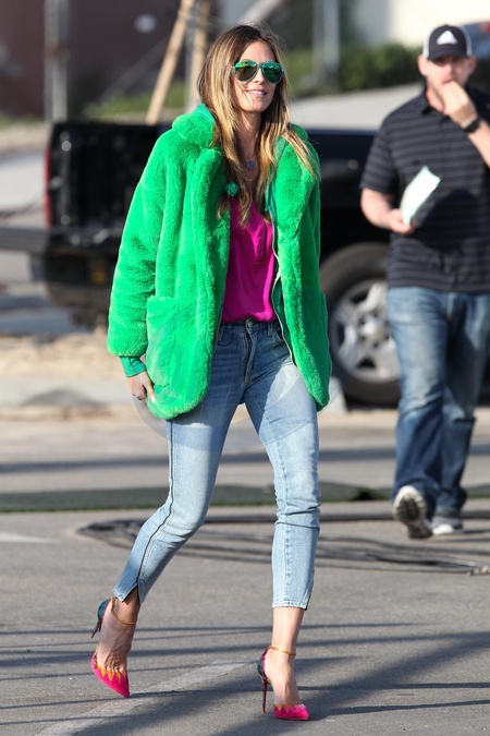 Heidi Klum w zielonym futerku na planie Next Top Model