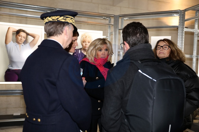 Brigitte Macron w czerwonym szalu Louis Vuitton na wystawie Detenus Bettina Rheims