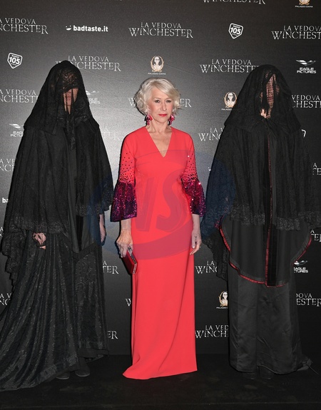 Helen Mirren w czerwonej sukni podczas Black carpet of film Winchester