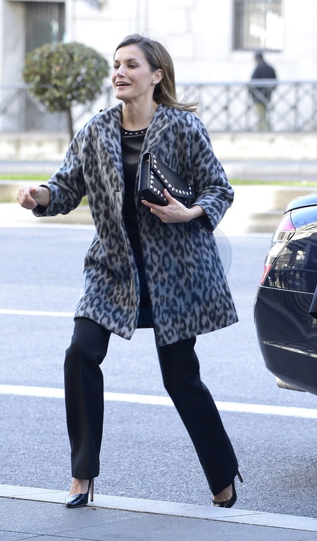 Krolowa Letizia w plaszczu we wzory leoparda i w skorzanej bluzce
