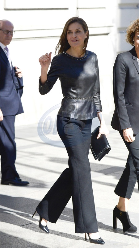 Krolowa Letizia w plaszczu we wzory leoparda i w skorzanej bluzce