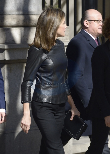 Krolowa Letizia w plaszczu we wzory leoparda i w skorzanej bluzce