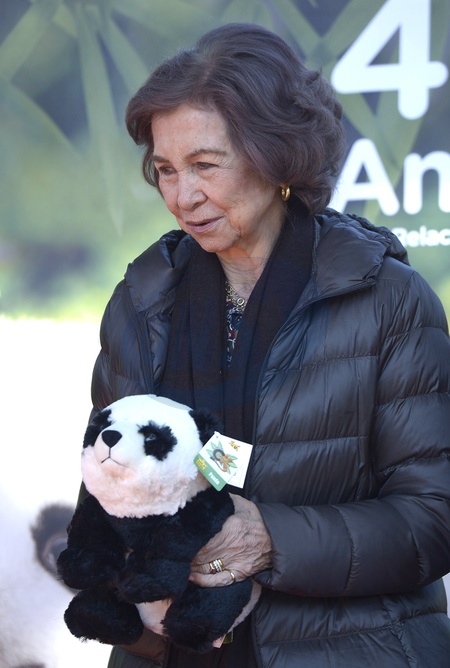 Krolowa Zofia pozuje do zdjec z pandami