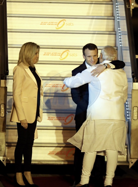 Macronowie w Indiach - powitanie na lotnisku