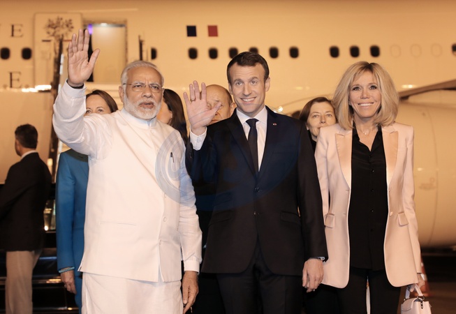 Narendra Modi, Emmanuel Macron, Brigitte Macron