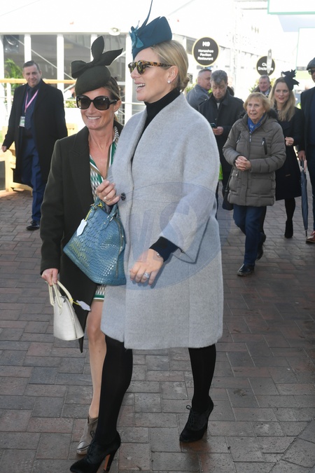 Zara Tindall w szarym plaszczyku na Cheltenham Racecourse