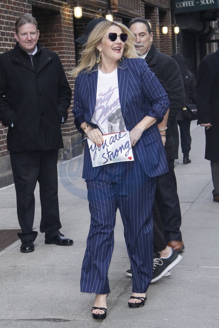 Drew Barrymore w garniturze w prazki i z torebka - You are strong