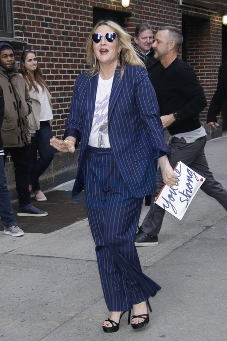 Drew Barrymore w garniturze w prazki i z torebka - You are strong