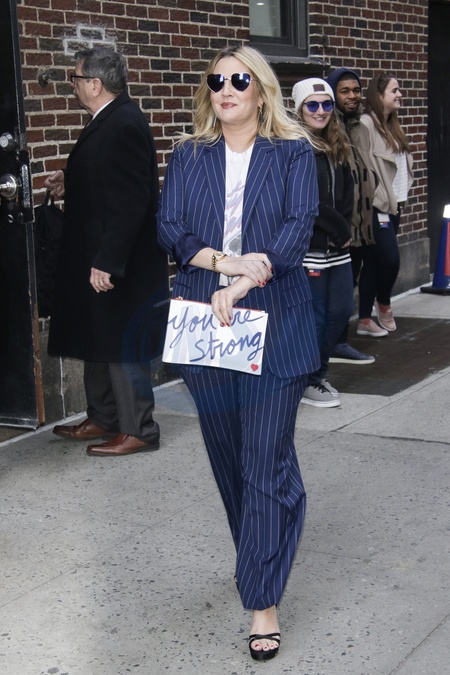 Drew Barrymore w garniturze w prazki i z torebka - You are strong