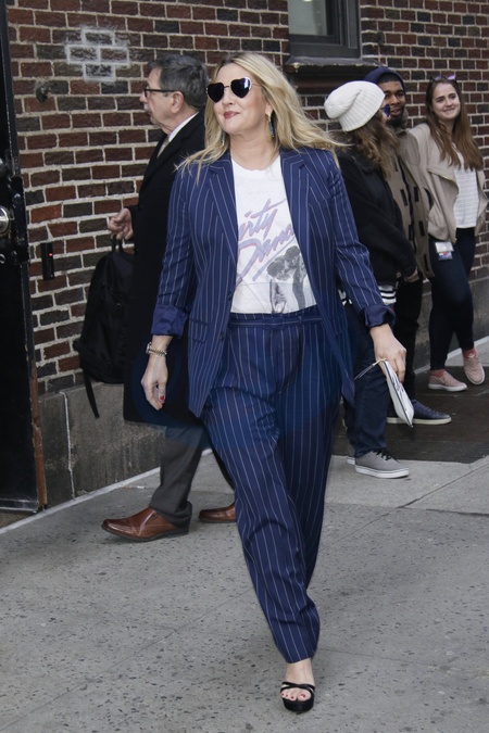 Drew Barrymore w garniturze w prazki i z torebka - You are strong