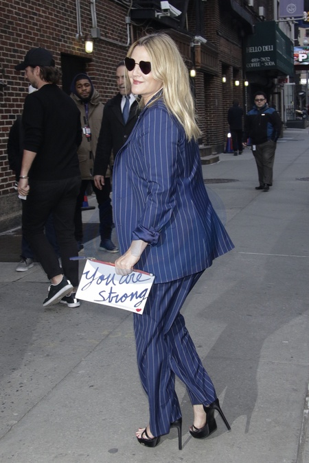 Drew Barrymore w garniturze w prazki i z torebka - You are strong