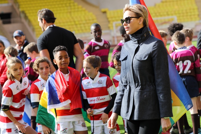 Ksiaze i ksiezna Monako z dziecmii na turnieju rugby - Sainte Devote Rugby Tournament