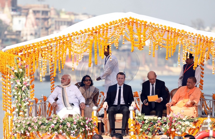 Narendra Modi, Emmanuel Macron, Yogi Adityanath, Jean-Yves Le Drian