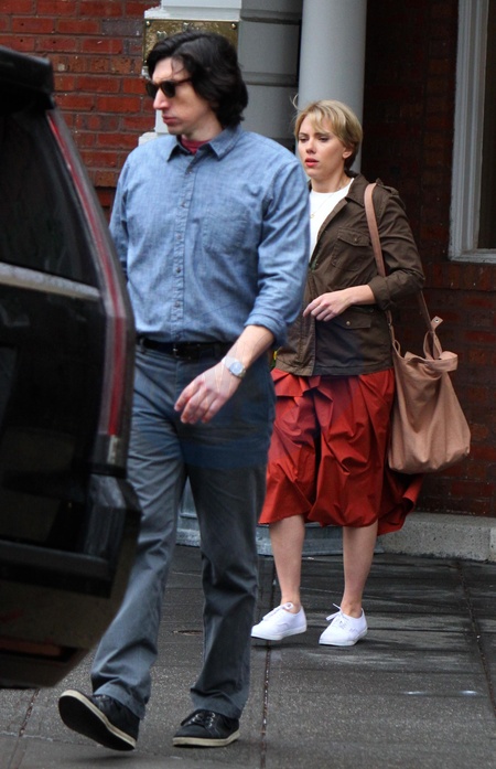 Scarlett Johansson w krotkich, blond wlosach na planie filmowym