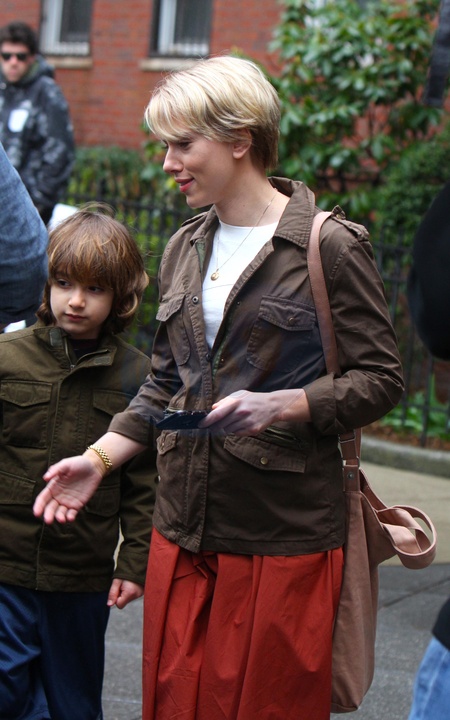 Scarlett Johansson w krotkich, blond wlosach na planie filmowym