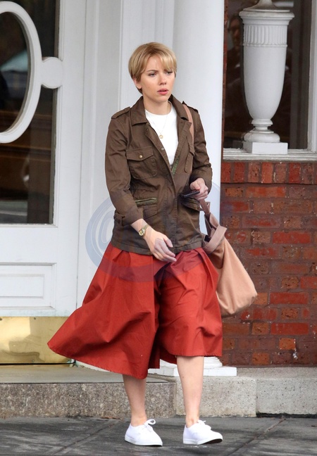 Scarlett Johansson w krotkich, blond wlosach na planie filmowym