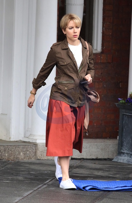 Scarlett Johansson w krotkich, blond wlosach na planie filmowym
