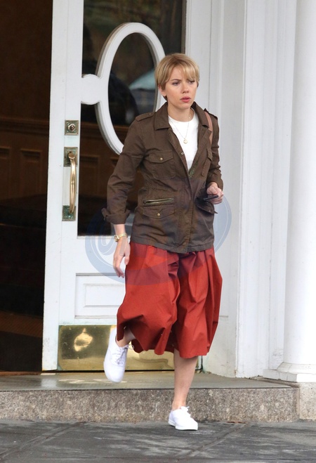 Scarlett Johansson w krotkich, blond wlosach na planie filmowym