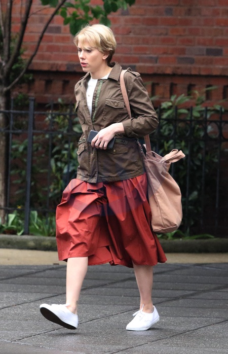 Scarlett Johansson w krotkich, blond wlosach na planie filmowym