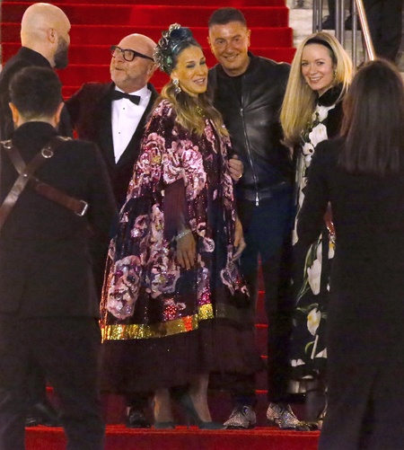 Sarah Jessica Parker w bogato zdobionym plaszczu na przyjeciu Dolce Gabbana
