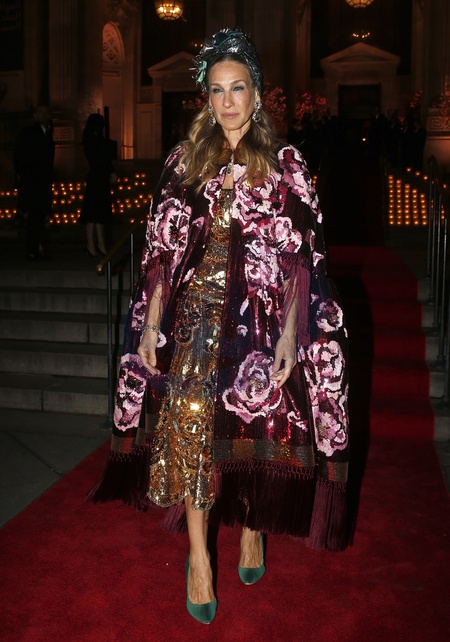 Sarah Jessica Parker w bogato zdobionym plaszczu na przyjeciu Dolce Gabbana