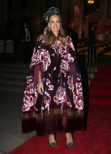Sarah Jessica Parker w bogato zdobionym plaszczu na przyjeciu Dolce Gabbana