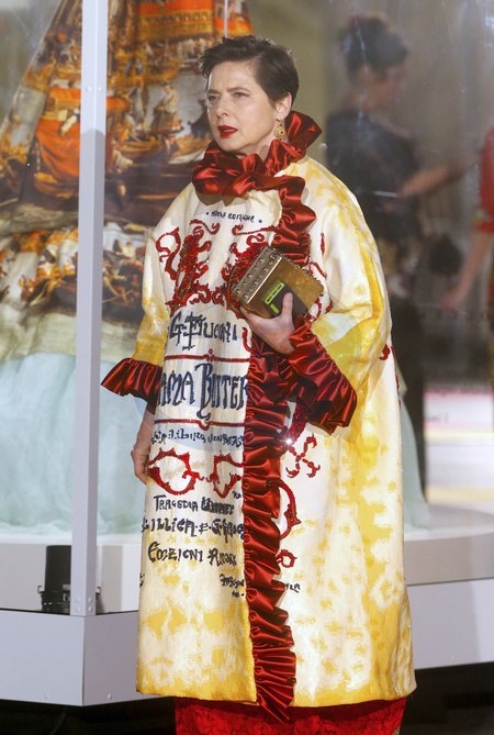 Isabella Rosselini w przykuwajacym wzrok plaszczu na Dolce & Gabbana Alta Moda 2018 collection
