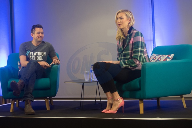 Karlie Kloss w kraciastej marynarce podczas dyskusji o przyszłosci umiejetnosci technicznych
