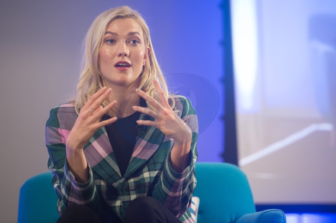 Karlie Kloss w kraciastej marynarce podczas dyskusji o przyszłosci umiejetnosci technicznych