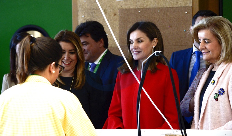 Krolowa Letizia w czerwonym plaszczyku z szerokimi rekawkami