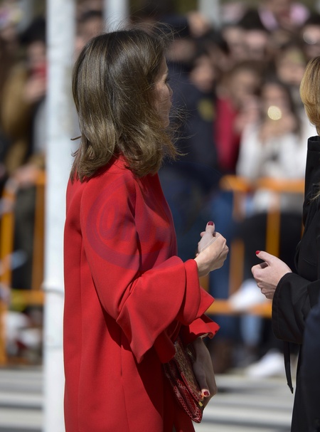 Krolowa Letizia w czerwonym plaszczyku z szerokimi rekawkami