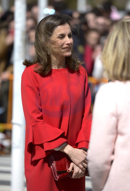 Krolowa Letizia w czerwonym plaszczyku z szerokimi rekawkami