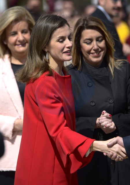 Krolowa Letizia w czerwonym plaszczyku z szerokimi rekawkami