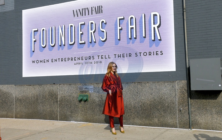 Natalia Vodianova w rdzawym plaszczu, zoltych szpilkach i okularach korekcyjnych
