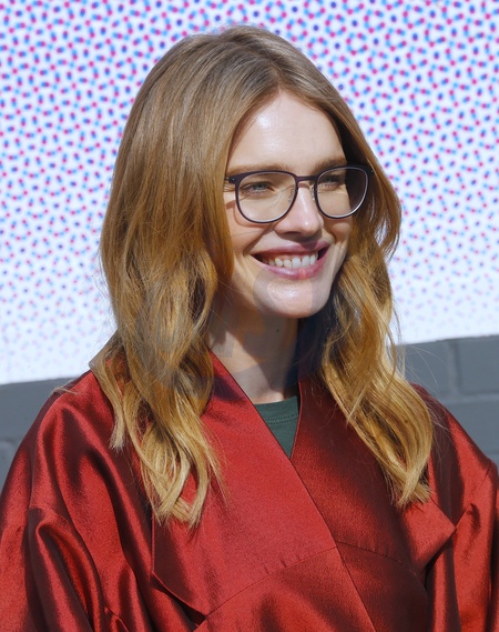 Natalia Vodianova w rdzawym plaszczu, zoltych szpilkach i okularach korekcyjnych