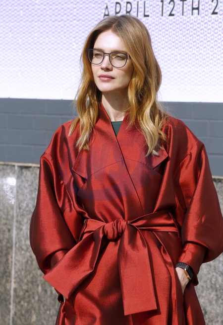 Natalia Vodianova w rdzawym plaszczu, zoltych szpilkach i okularach korekcyjnych