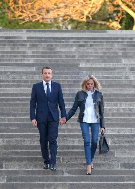 Brigitte Macron i Emmanuel Macron trzymaja sie za rece, w drodze na wywiad do Palais de Chaillot