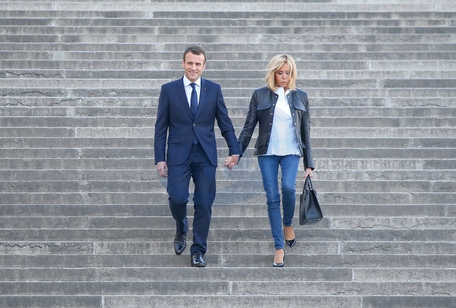 Brigitte Macron i Emmanuel Macron trzymaja sie za rece, w drodze na wywiad do Palais de Chaillot