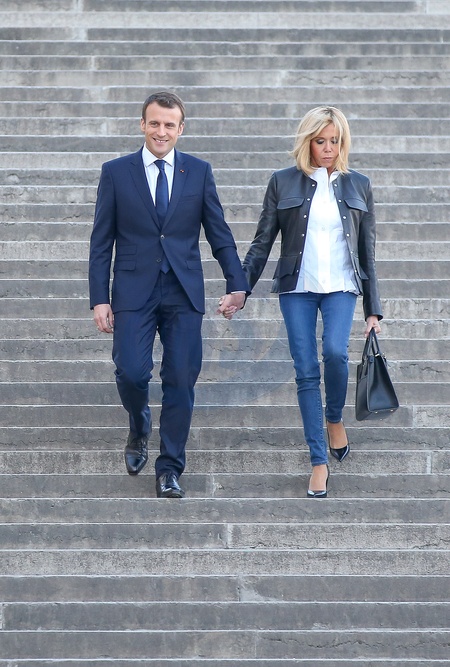 Brigitte Macron i Emmanuel Macron trzymaja sie za rece, w drodze na wywiad do Palais de Chaillot