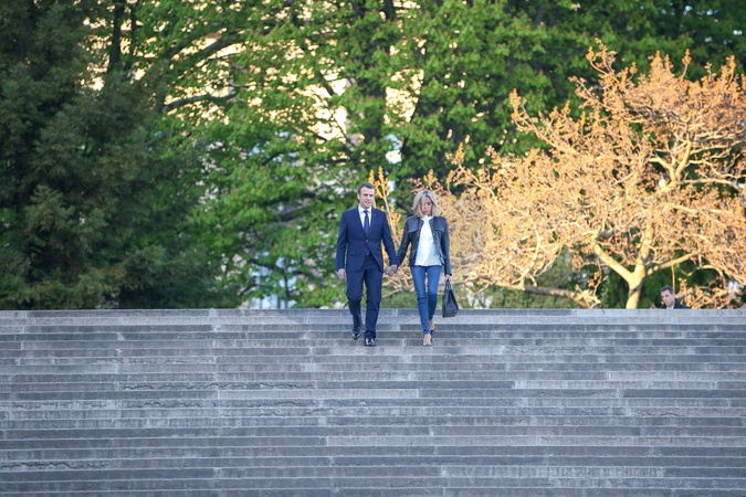 Brigitte Macron i Emmanuel Macron trzymaja sie za rece, w drodze na wywiad do Palais de Chaillot