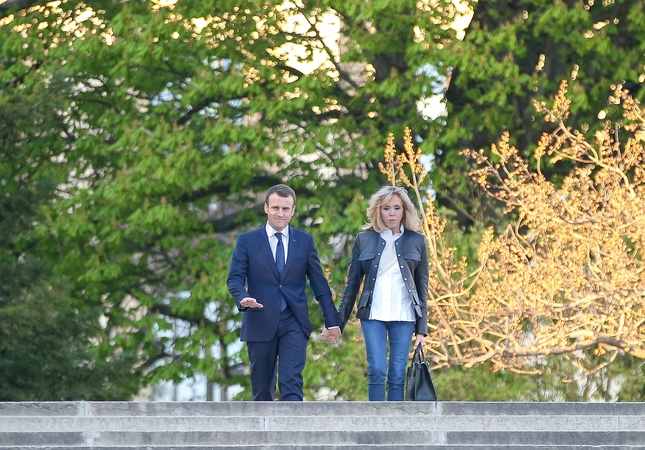 Brigitte Macron i Emmanuel Macron trzymaja sie za rece, w drodze na wywiad do Palais de Chaillot