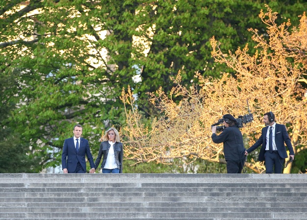 Brigitte Macron i Emmanuel Macron trzymaja sie za rece, w drodze na wywiad do Palais de Chaillot